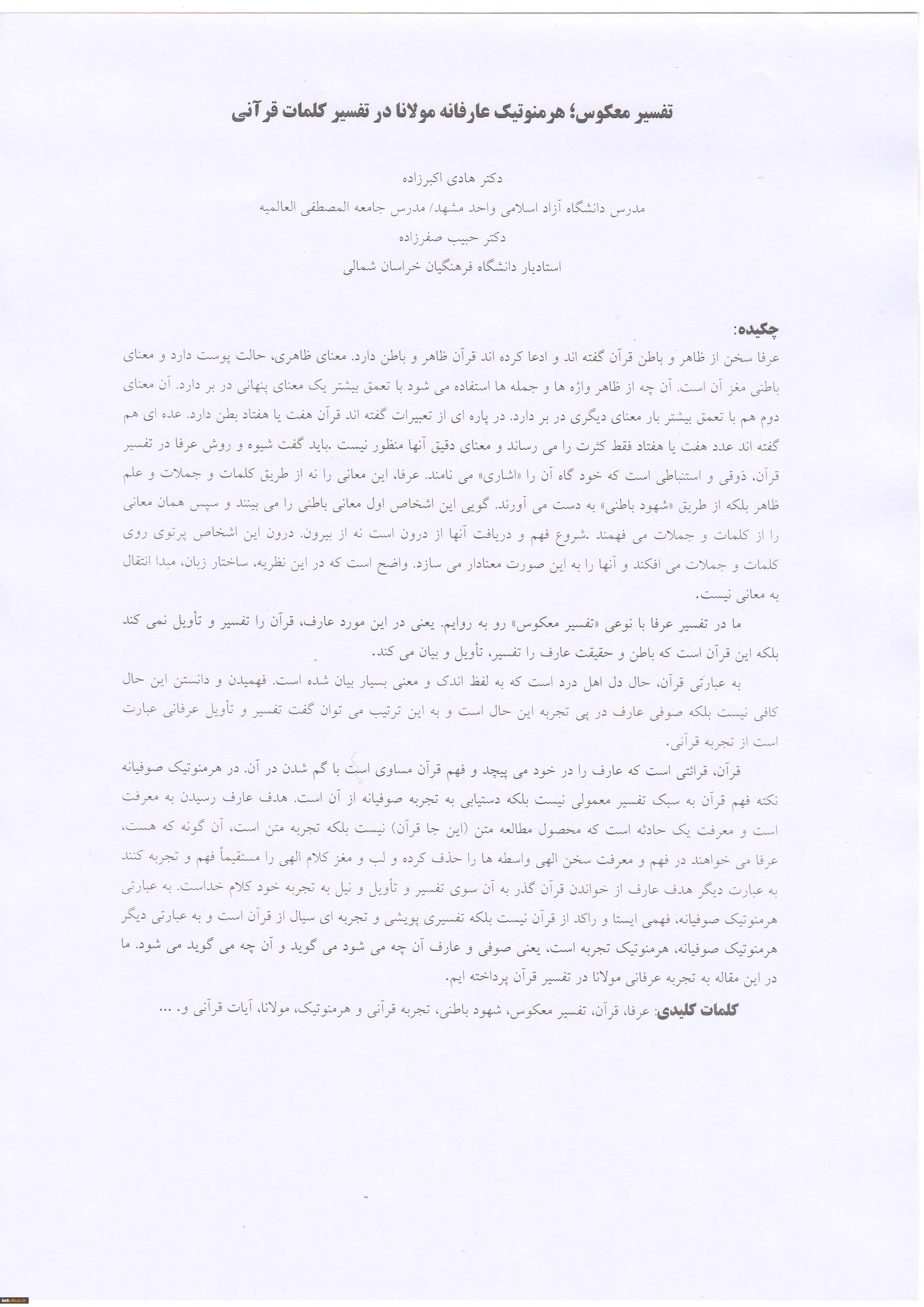 امتیاز دهید : مقاله تفسیر معکوس؛ هرمنوتیک عارفانه مولانا در تفسیر کلمات قرآنی 2 یکشنبه 1 آذر 1394 ساعت 10:01