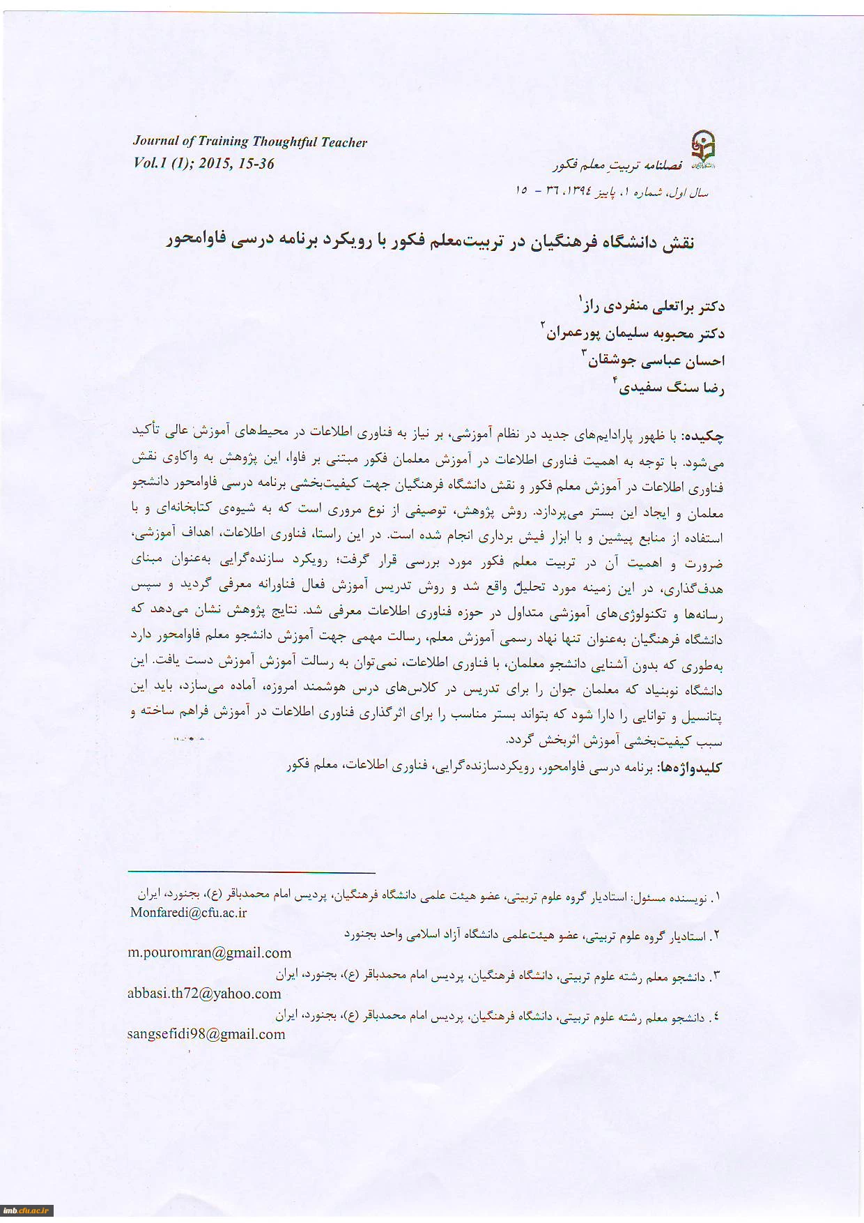 امتیاز دهید : مقاله نقش دانشگاه فرهنگیان در تربیت معلم فکور با رویکرد برنامه درسی فاوامحور 2 دوشنبه 14 دی 1394 ساعت 9:57