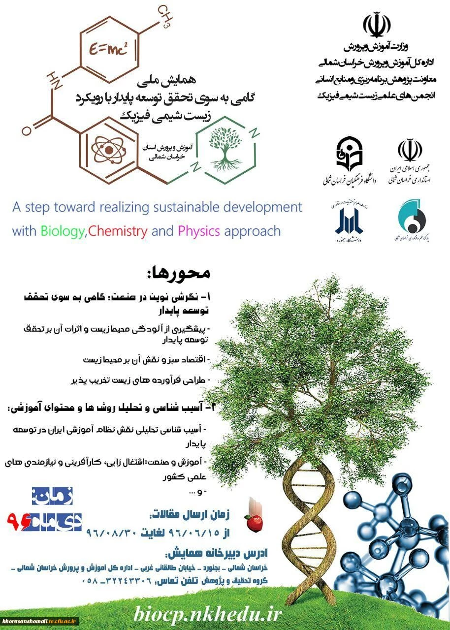 امتیاز دهید : همایش ملی گامی به سوی تحقق توسعه پایدار با رویکرد زیست، شیمی و فیزیک 2 چهارشنبه 10 آبان 1396 ساعت 7:40