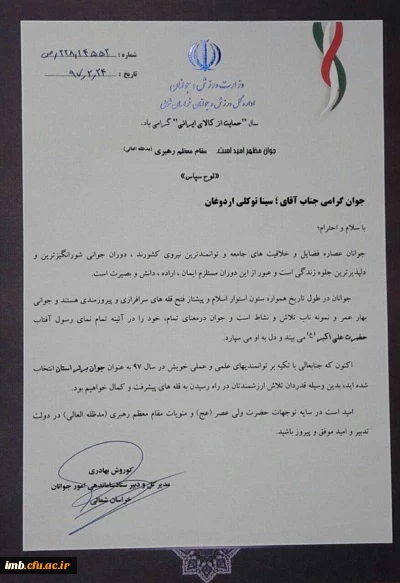 انتخاب شایسته دانشجومعلم سینا توکلی به عنوان جوان برتر استان خراسان شمالی در حوزه علمی-دانشگاهی 3