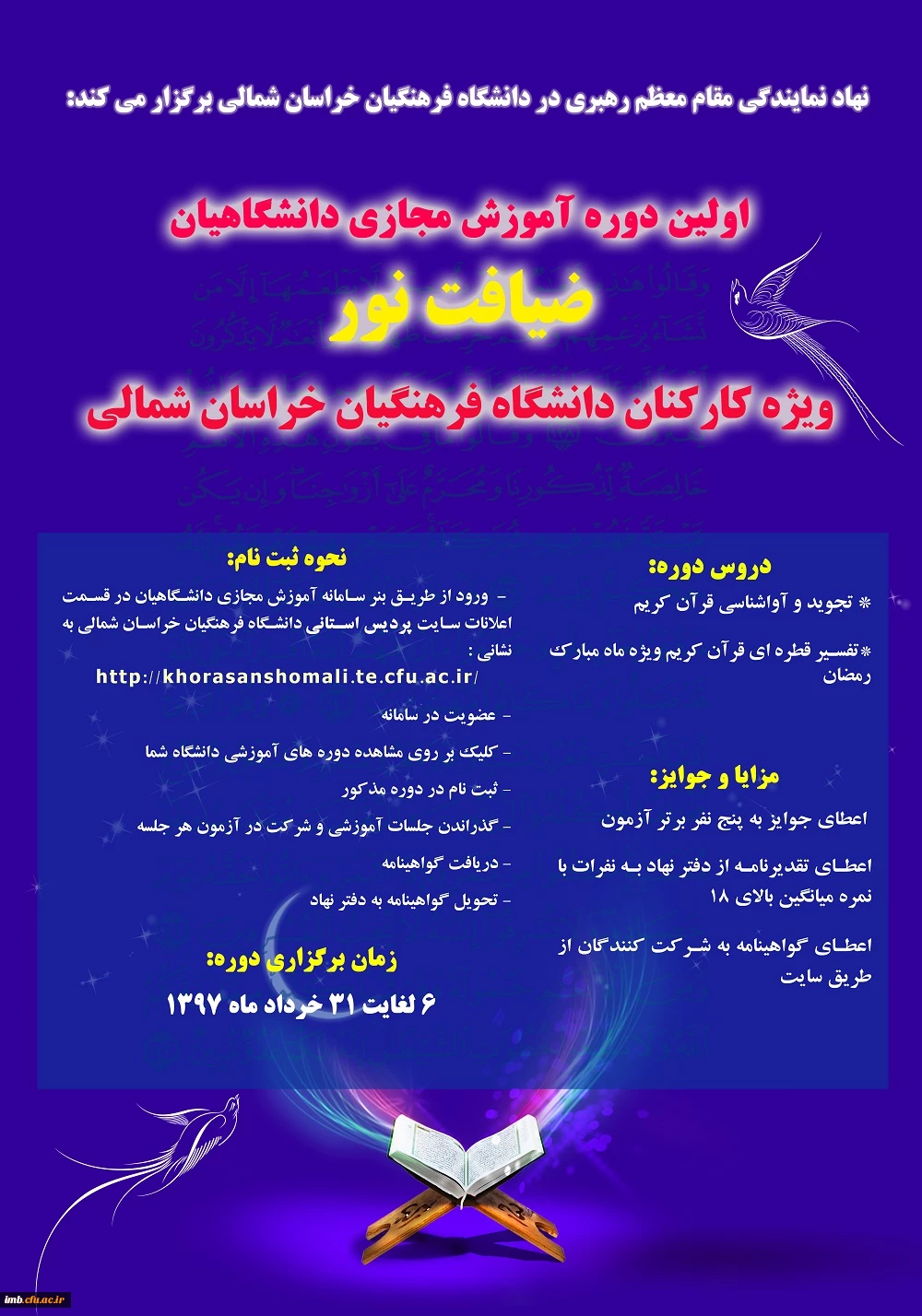 اولین دوره آموزش مجازی دانشگاهیان " ضیافت نور "، ویژه کارکنان دانشگاه فرهنگیان خراسان شمالی برگزار گردید. 2