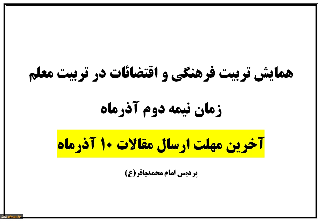 امتیاز دهید : آخرین مهلت ارسال مقالات همایش تربیت فرهنگی و اقتضائات در تربیت معلم 2 سهشنبه 4 آذر 1393 ساعت 13:19